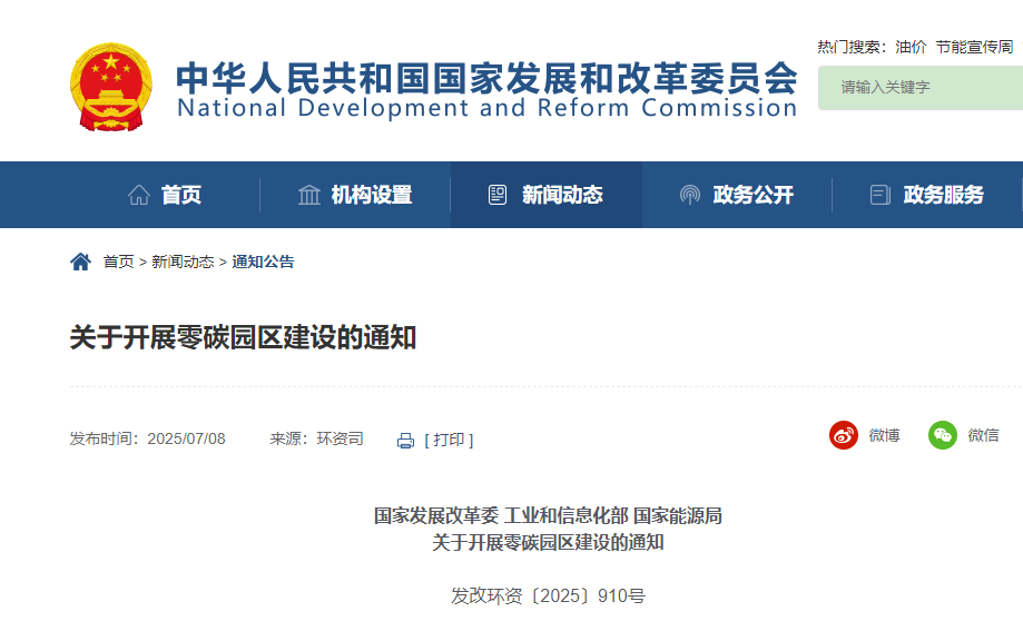 國家發(fā)展改革委 工業(yè)和信息化部 國家能源局印發(fā)《關于開展零碳園區(qū)建設的通知》 2025-07-08